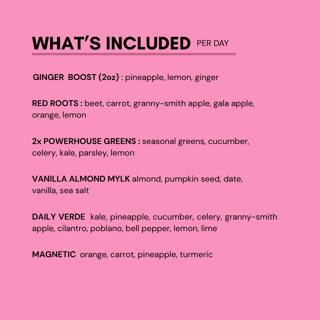 The Refresh Cleanse includes five intentionally crafted cold-pressed juices, one immunity shot and one vanilla almond pumpkin seed milk per day. Designed to make resetting simple and supportive, all you need to do is choose the number of days you’d like to cleanse and we’ll handle the rest.
